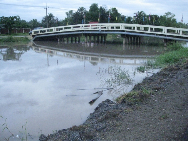 Khlong six up a foot or more over normal ? There was a barge with a suicide jocky operating the digger along there clearing dredging the crap he pulled out was placed as a wall along the bank ? Not the brightest thing to do with it as it has since disapeared almost completely then of coure they started resurfacing the road as well seemingly making it a tad wider towards the khlong so in went the rest of the spoils acompanied with road gravel ?