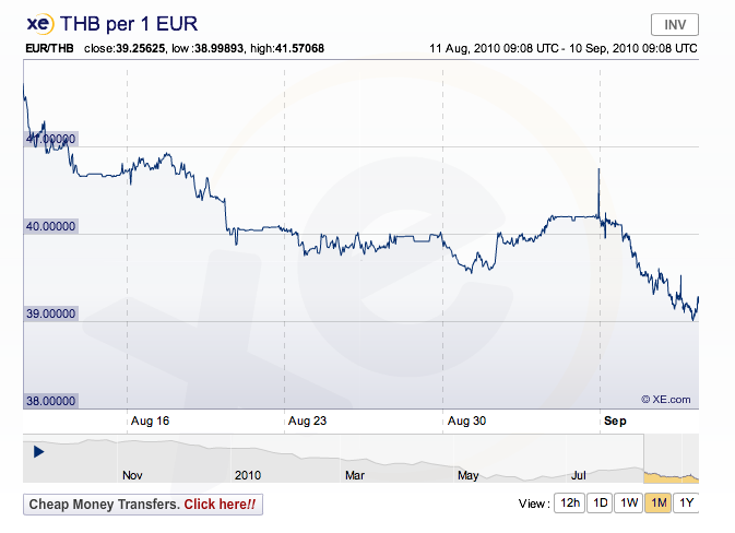 The roof and everything else is at 39 or 40 Baht to the Euro and if I'm short I might have to borrow some money from a Canadian.