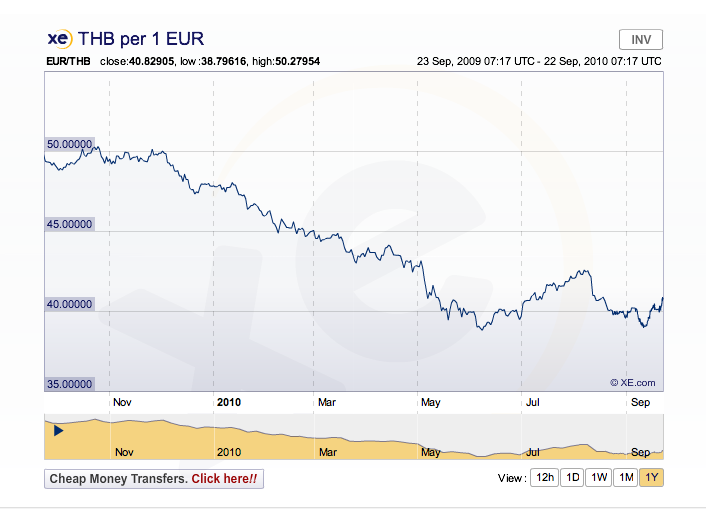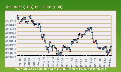 When you could get 42.58 on Aug. 3 then 39.15 on Sept. 9 about 3.5 baht now that is volatile. Add this to all the other charges for transferring money and the picture is not so good.