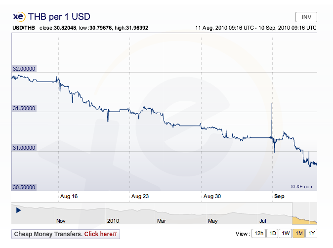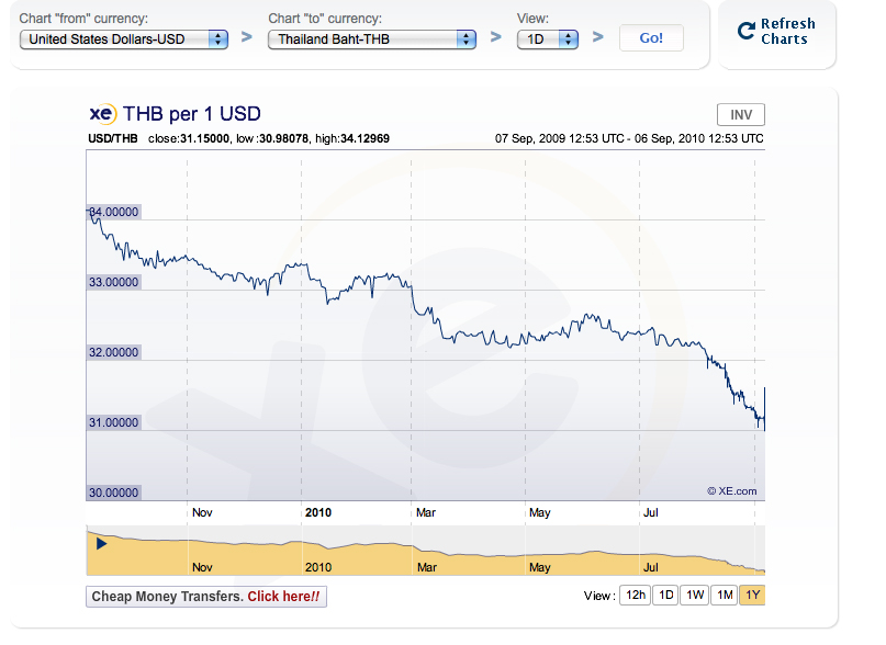 I just checked my account at Siam Commercial Bank where one of my pensions goes direct in Baht from the Australian Government every 28 days (not every month). The money was due in today anyway. Good news for all you Aussies, even though the Baht has appreciated, it has not done so by much. My calculations show it has risen/dropped just a little over .43% (less than 2,000 in every 100,000). I'm pleased I'm not American the way the US is going with its economy. I wonder when they'll take over their so-called Federal Reserve Bank (from the Germans and others) and properly regulate their banks?
