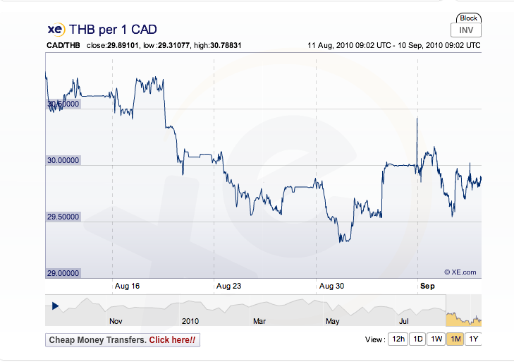 The Aussie dollar has remained fairly stable throughout and has fluctuated between 26 and 32 and is currently at 28 - 29. I get a far better rate when the Australian Government deposits my pension in Thai Baht than I could converting it over here, which means the banks and the Central Bank are robbing everyone blind with their exchange rates. The same with Visa and Mastercard conversions; I get a far better rate when Visa or Mastercard do the conversion than are advertised in the newspapers or at the bank's counter.