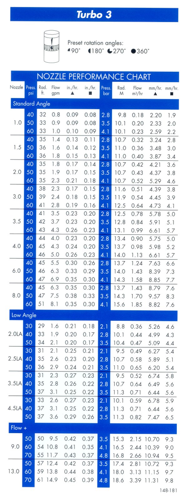 Precipitation Rate: Approx. 0.4 - 0.6" per hour @ 50 psi 10 - 15 mm per hour @ 3,5 bar